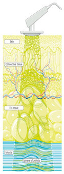 往来の電気治療器の外部からの刺激とは違い 患者さん自身の身体の中で発生し、組織の奥深く(皮下8センチ)に作用する今までにない最新の治療です