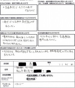 同じ症状でお悩みの方へメッセージをお願いします。むちうちは早めの対処が良いといわれています。寺岡接骨院に診て頂きよかったです。