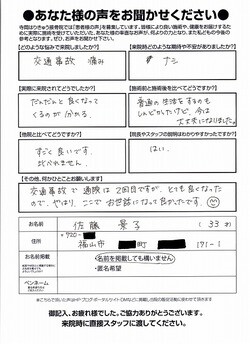 同じ症状でお悩みの方へメッセージをお願いします。交通事故で通院は2回目ですが、とても良くなったので、やはり、ここでお世話になって良かったです。