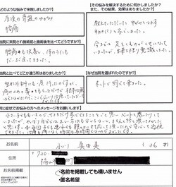 他院と比べてどこか違う所はありましたか?整形外科にも一度行ったのですが、痛み止めの薬をもらっただけで、根本治療はできなかったので、ここでじっくり治療していただいてよかったです。
