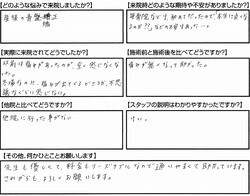 他院と比べてどこか違う所はありましたか?他院に行った事が無い。スタッフの説明はわかりやすかったです。先生も優しくて、料金もリーズナブルなので通いやすくて助かっています。これからもよろしくお願いします。