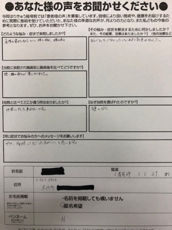 同じ症状でお悩みの方へメッセージをお願いします。ぜひ施術してもらった方がいいと思います