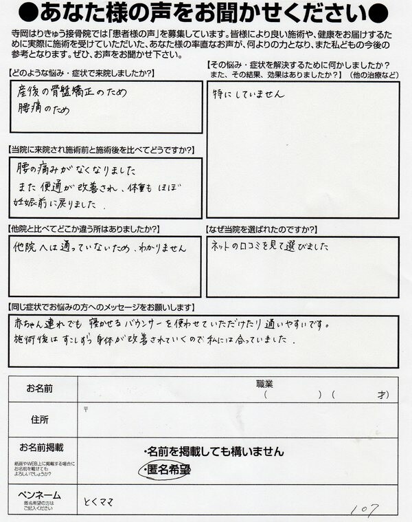 産後の骨盤矯正で腰痛便通体重が改善した福山市のとくママさん