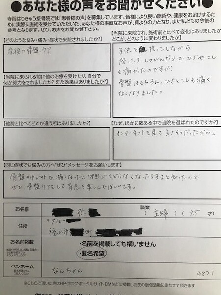 当院に来院され施術前と施術後と比べてどうですか?子どもを抱っこしながら座ったりしゃがんだりでひざやこしも痛かったのですが骨盤はもちろんひざもこしも痛くなくなりました