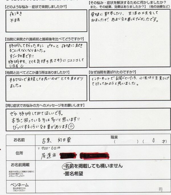 当院に来院され施術前と施術後と比べてどうですか?施術してもらった日にピタっと夜間に起きることはなくなりました